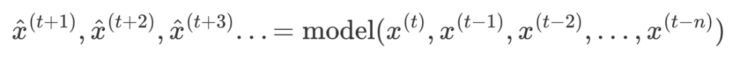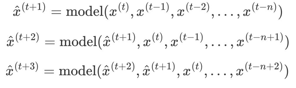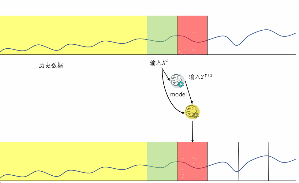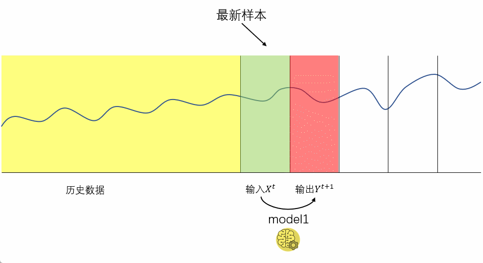 多步递归预测在单步预测的基础上,把下一步的预测值作为输入,来进行迭代预测。需要注意的是:在多变量的多步回归分析中,由于存在外部变量作为输入,需要同时预测外部变量。多步递归的过程如下图所示: