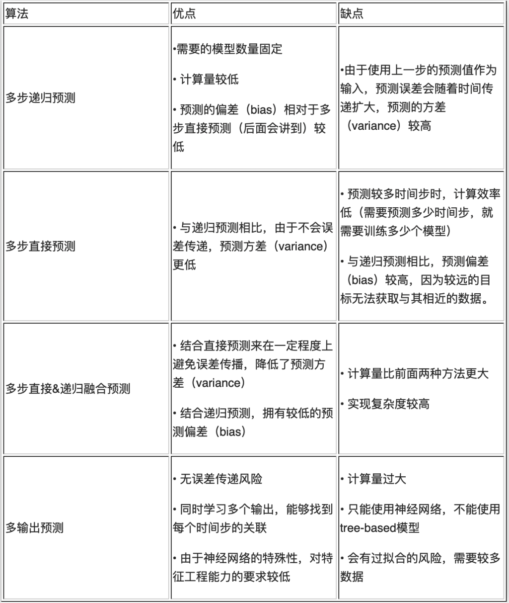 本篇文章中,我们展示了4种基于机器学习进行多步时间序列预测的方法。下列表格中分别列出了各个算法的优缺点。