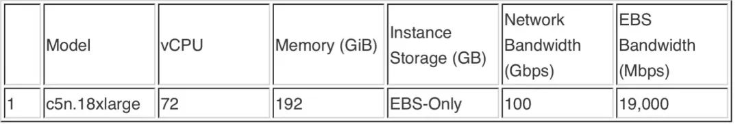 为了达到100 Gbps 的目标,我们选择 c5n.18xlarge 的 EC2 实例,在EC2实例家族中带 n 的实例都具有更高的网络性能,这款 c5n.18xlarge 的网络性能就可以达到100 Gbps,它的基本配置为: