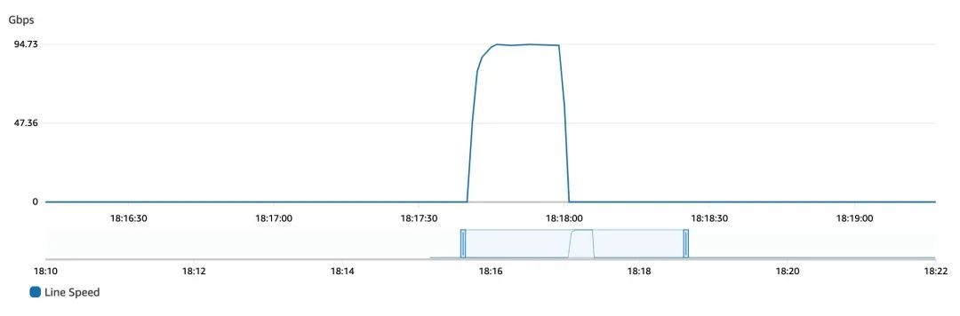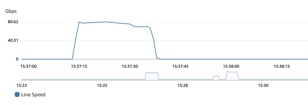 200 GiB 的对象下载花了24秒,整体下载速度为 8.24 GiB/s,而在更客观的 CloudWatch 监控数据中我们看到了峰值80.62 Gbps。