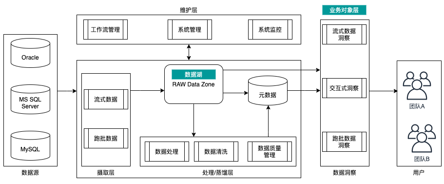 如果用户希望和业务直接相关的数据可以更持久的存储并且做一些离线的分析,很多企业会构建自己的大数据分析平台,把数据存储到平台进行分析,就好比水从源头流入湖中,各种用户都可以来湖里获取、蒸馏和提纯这些水(数据)。下图是数据湖的一个典型逻辑架构,它是由多个大数据组件、云服务组成的一个解决方案,包括摄取层、处理/蒸馏层、维护层和数据洞察。