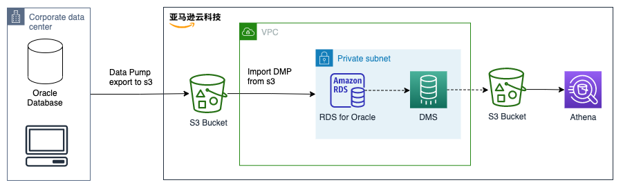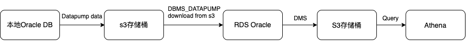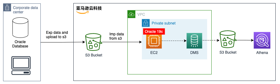 使用 Oracle 数据泵将本地 Oracle 数据库数据导出,上传到 s3 存储桶,再由适用的 Amazon RDS for Oracle 加载数据,利用 DMS 服务将 RDS Oracle 数据库数据迁移到 s3 存储桶,使用云上的大数据组件 Athena 进行分析。