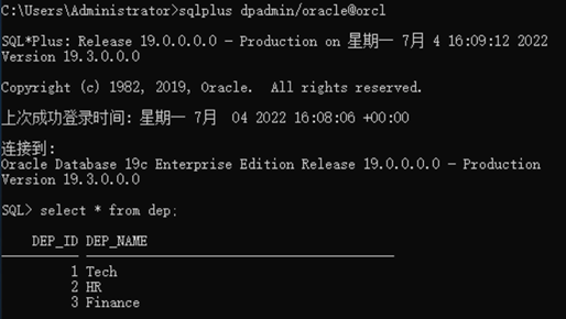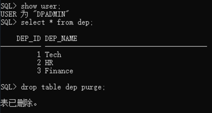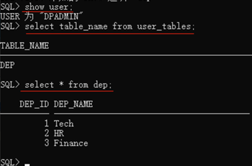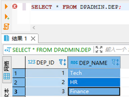 1. 在本地 DPADMIN 用户下新建一个表 dep,插入数据。