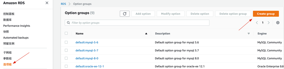 5. 在 Configuration –> Option groups 下查看当前选项组,变更完成。