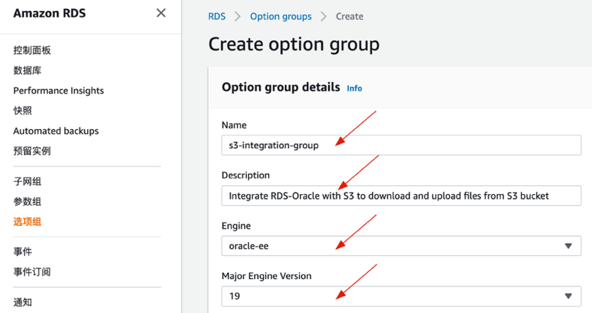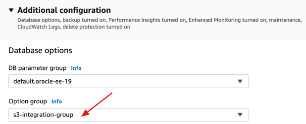 3. 把 Option group 选择为刚才新建的 s3-integration-group。