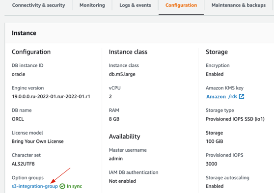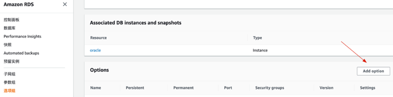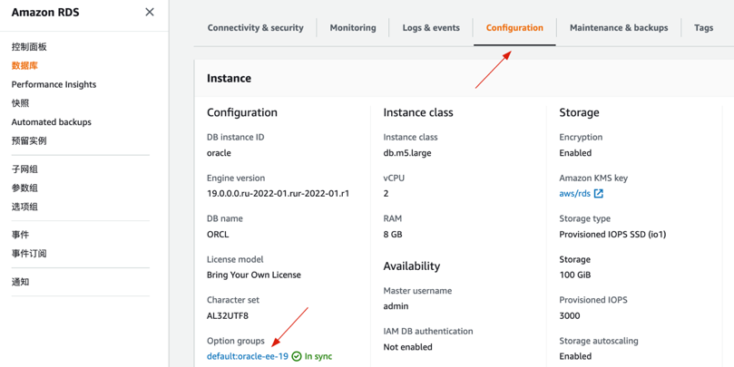 1. 回到 RDS Oracle,选择 Configuration,可以看到现有的 Option Groups。