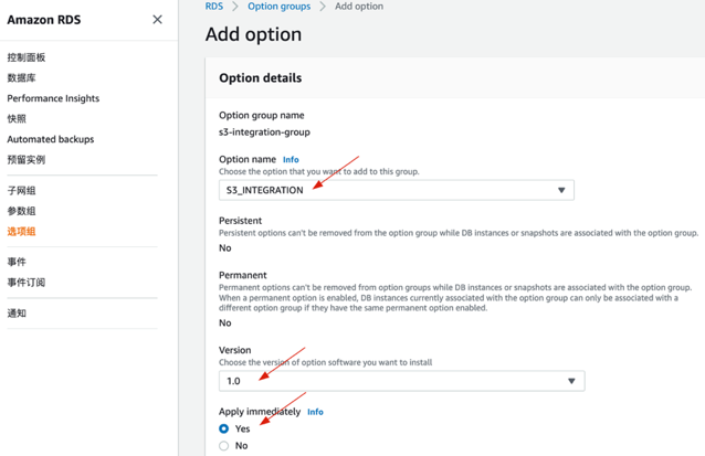 2. 在 Option name 选择 S3_INTEGRATION,Version 选择1.0,立即应用。