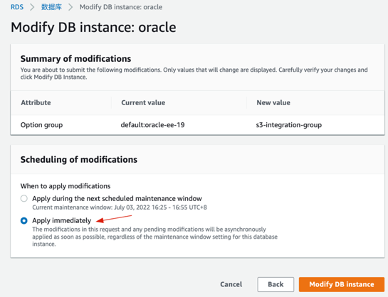 4. 修改 DB 实例,立即应用,该过程不需要重启实例。