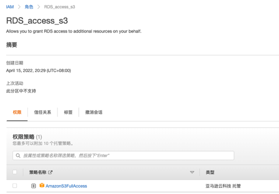 1. 在 IAM –> 角色下,创建 RDS Role,附加可以访问对应 s3 存储桶的策略。