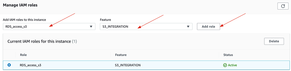 2. 在 RDS –> 数据库 –> Oracle –> Connectivity & security –> Manage IAM roles 下,选择创建的 RDS_access_s3 角色和 S3_INTEGRATION 功能,添加角色。