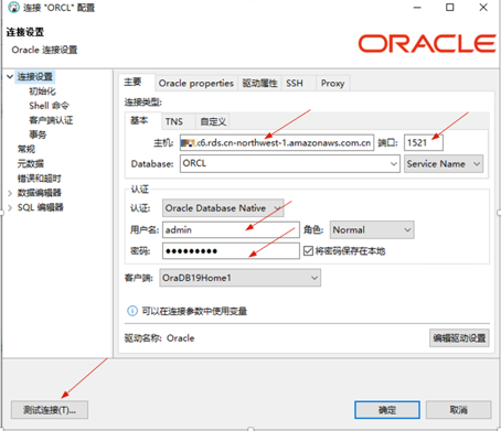 1. 在终端节点上,使用 DBveaver 工具管理 RDS Oracle。配置其连接的 URL、用户名和口令。