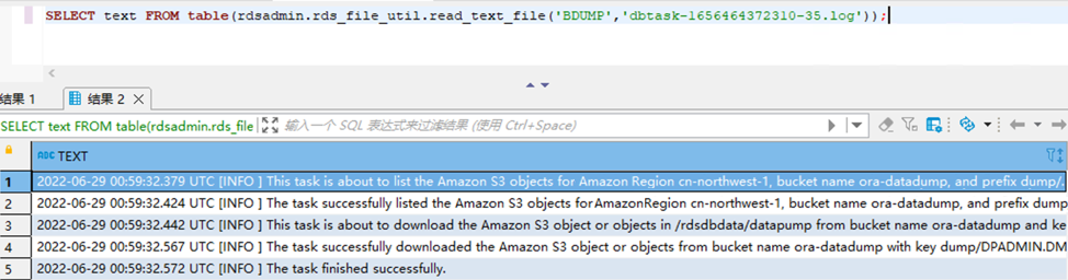 4. 使用 rdsadmin.rds_file_util.read_text_file 存储过程查看 bdump 文件的内容。