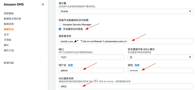 2. 配置终端节点 RDS Oracle 的用户名和口令。