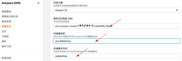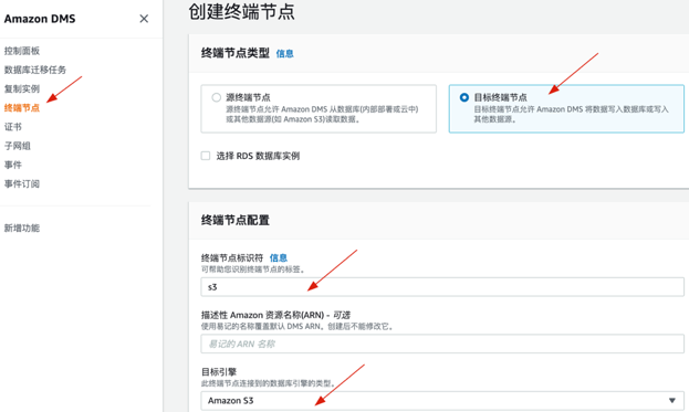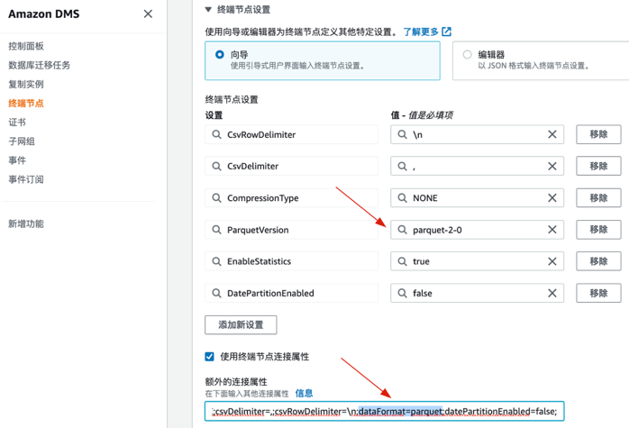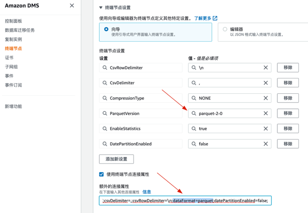 4. 配置终端节点 s3 参数,使用以下额外连接属性来指定输出文件的 Parquet 版本: