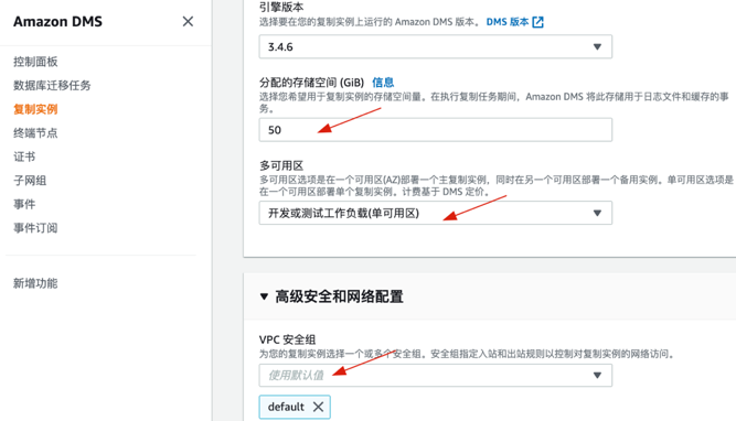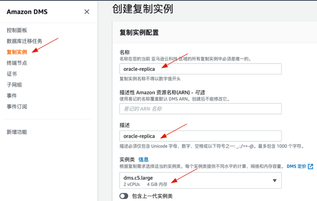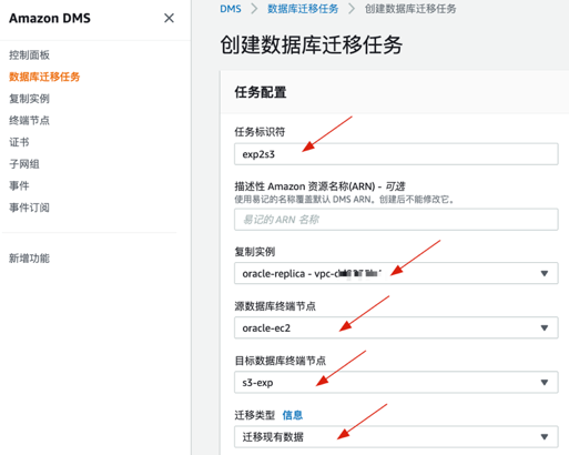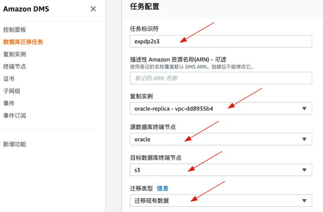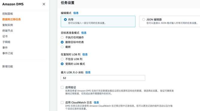 1. 创建数据库迁移任务,命名标识符,选择创建的复制实例,选择源和目标终端节点。