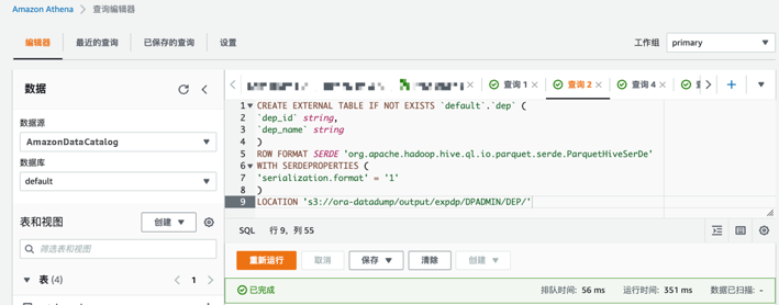 4. 使用 DMS 将数据导出 Parquet 格式存在 s3,并能查询到表;