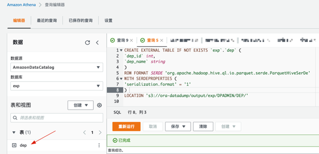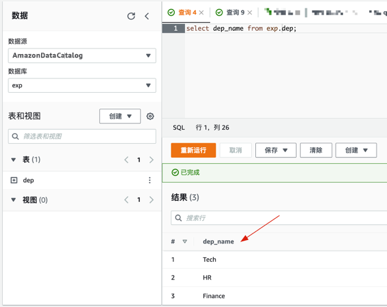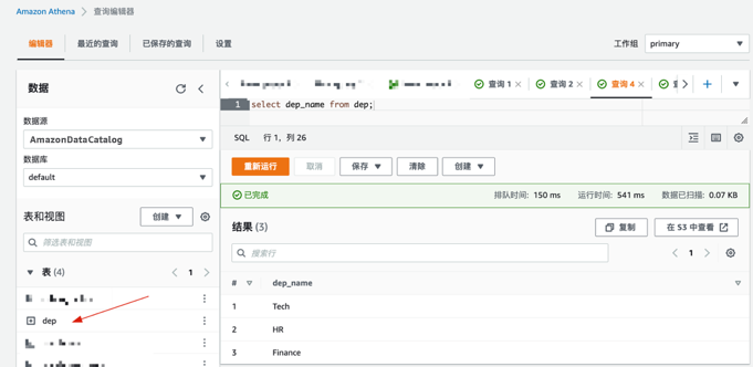2. 在 Default 数据库下创建表 dep,CREATE TABLE 语句必须包含分区详细信息,使用 LOCATION 指定分区数据的根位置,运行以下内容进行查询。