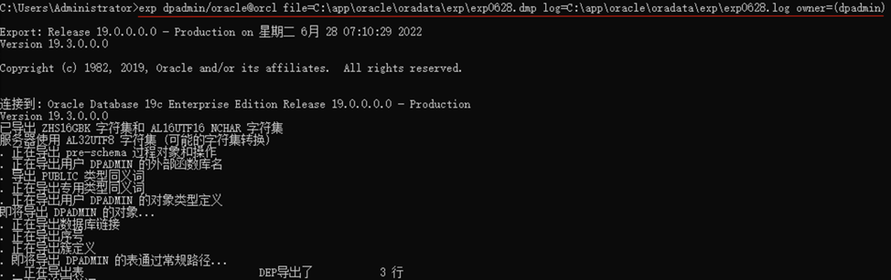 exp dpadmin/oracle@orcl file=C:\app\oracle\oradata\exp\exp0628.dmp log=C:\app\oracle\oradata\exp\exp0628.log owner=(dpadmin)