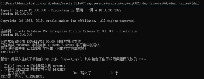 imp dpadmin/oracle@orcl file=C:\app\oracle\oradata\exp\exp0628.dmp fromuser=dpadmin tables=(dep)