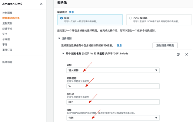 3. 配置数据库迁移任务“表映像”,架构名称为%,表名称为之前创建的 DEP。