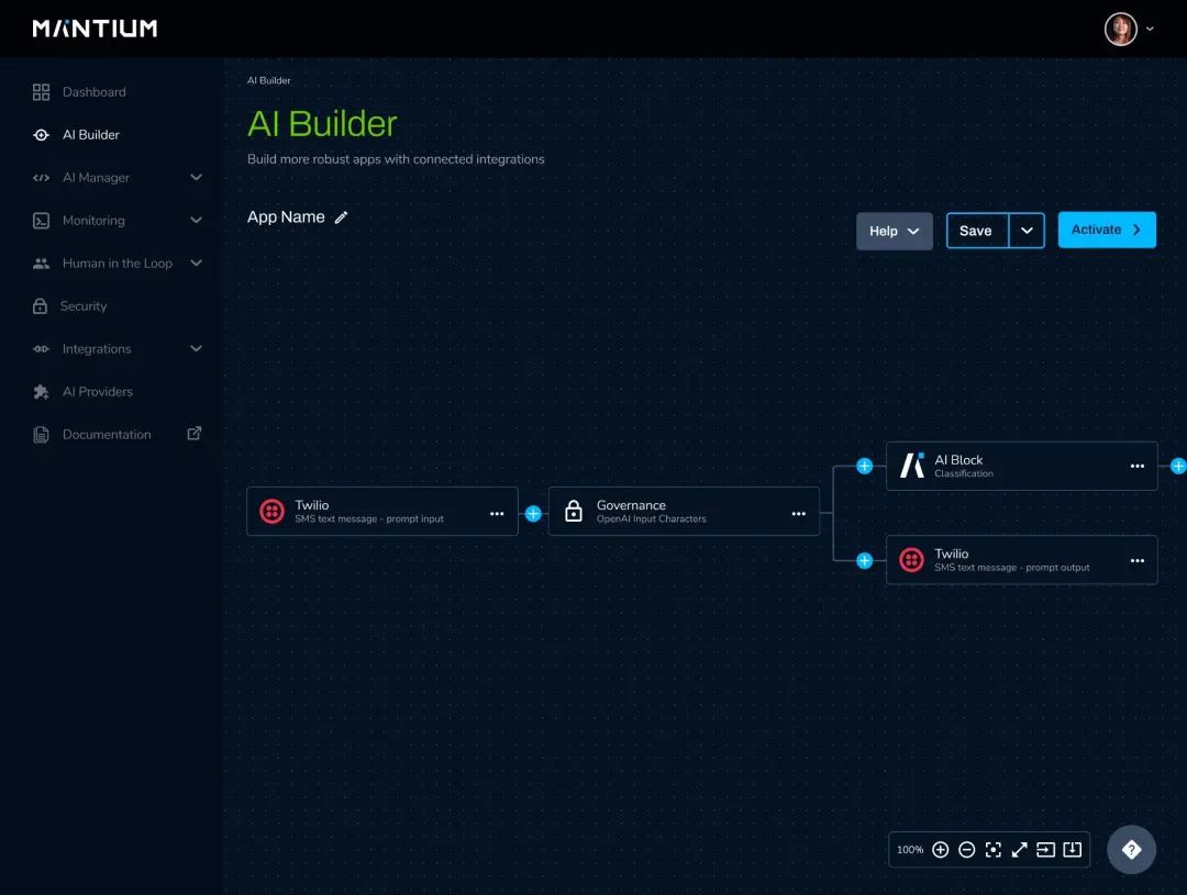 借助 Mantium AI Builder,您可以开发先进的工作流来集成外部 API、逻辑运算和 AI 模型。以下屏幕截图显示了一个示例 Mantium AI 应用程序,该应用程序将 Twilio 输入、治理政策、AI 块(可以依赖像 GPT-J 这样的开源模型)和 Twilio 输出联系起来。