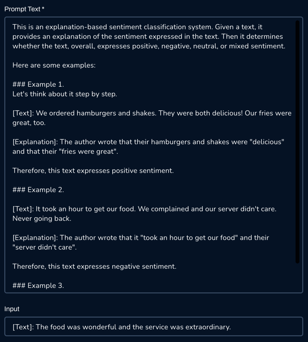 例如,以下屏幕截图显示了生成解释和情绪预测的情绪分析提示的简短演示。在此示例中,作者的原文是“食物很美味”并且“他们的服务非常出色”。因此,这段文字表达了积极的情绪。