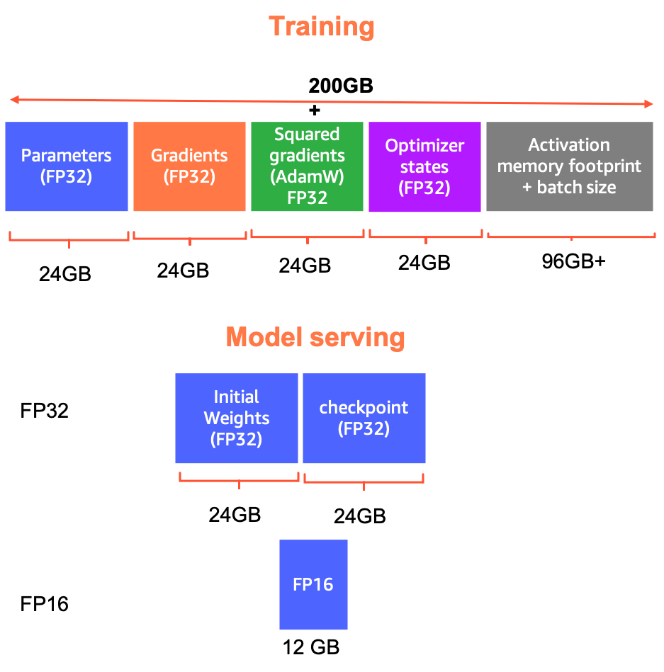 也就是说,GPT-J 仍然相当大。例如,在 FP32 中使用完整权重更新和 Adam 优化器训练 GPT-J 需要超过 200 GB 的内存:模型参数占用 24 GB,渐变占用 24 GB,Adam 的平方梯度占用 24 GB,优化器状态占用 24 GB,其他内存量用于加载训练批次和存储激活项。当然,在 FP16 中训练可以将所需内存减少近一半,但超过 100 GB 的内存占用仍需要创新性的训练策略。例如,Mantium 的 NLP 团队与 SageMaker 合作,开发了一个使用 SageMaker 分布式模型并行库训练(微调)GPT-J 的工作流。