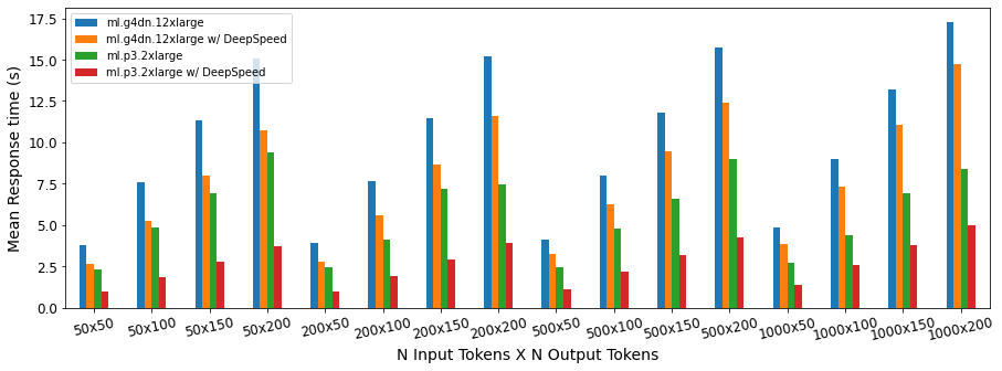 值得注意的是,在配备了 NVIDIA V100 GPU 的 ml.p3.2xlarge 实例上,DeepSpeed 的加速效果甚至更好。在该硬件上,我们发现平均延迟减少了 53%(SD = 0.07)。就每秒令牌数而言,这相当于从平均每秒 21.9(SD = 1.97)个令牌增加到平均每秒 47.5(SD = 5.8)个令牌。