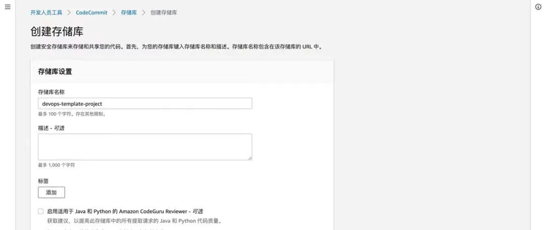 选择右边菜单栏存储库,点击创建存储库, 输入存储库名字devops-template-project,及其他可选配置,点击创建