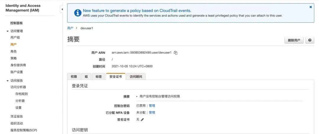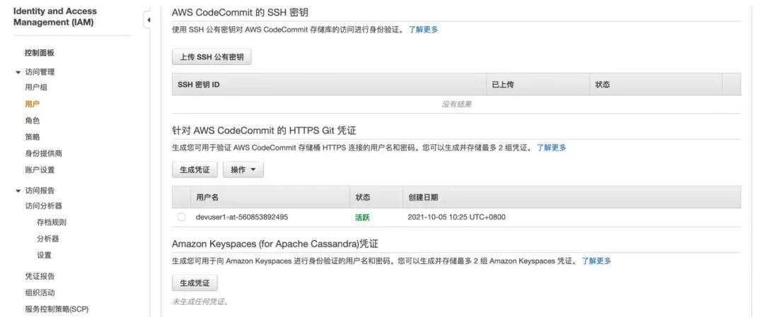 默认用当前用户访问存储库,用户需要具有Amazon CodeCommit访问权限,也可以创建访问该存储库的新用户