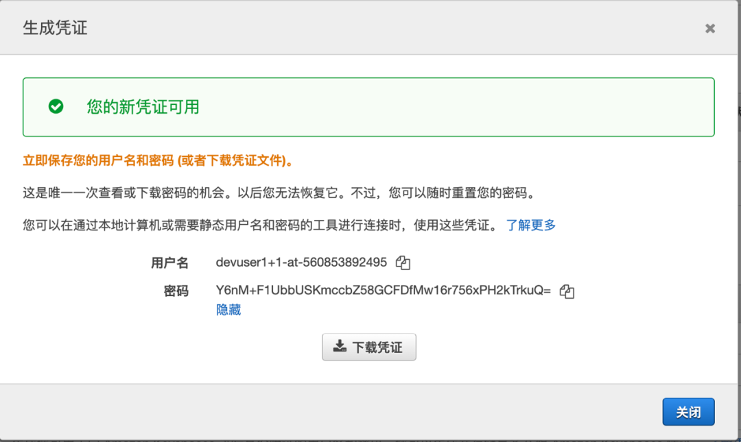 安全证书设置页面中生成Amazon CodeCommit的HTTPS Git凭证,保存下载用户和密码