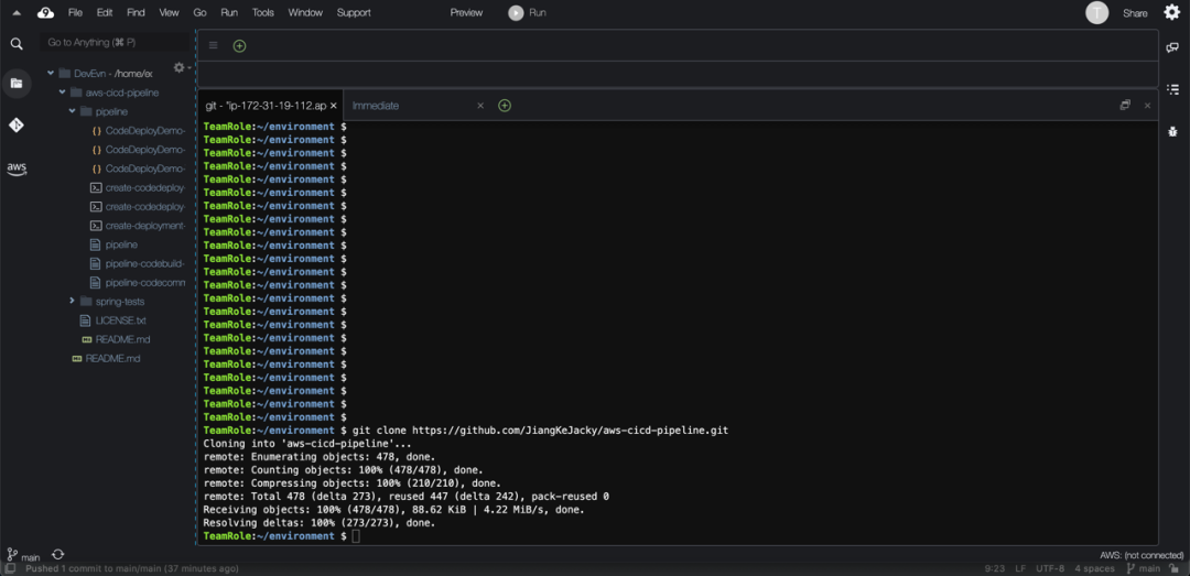 Aws-cicd-pipeline文件包含两部分:pipeline包含构建pipeline环境执行脚本和代码;spring-test是一个包含单元测试、部署规范、部署脚本的spring工程脚手架,用户可根据需要在脚手架的基础上构建工程。