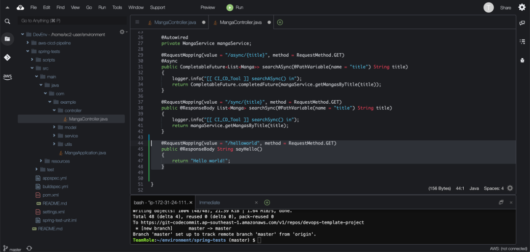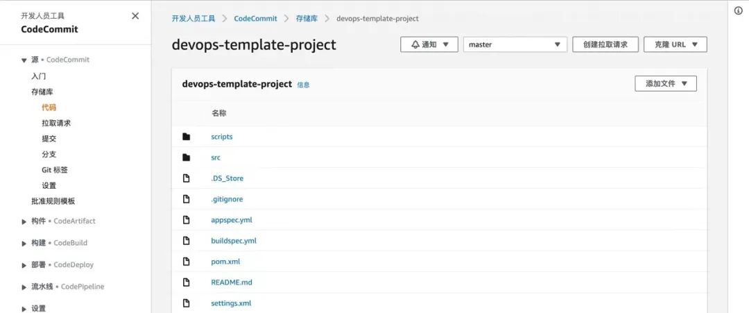 在亚马逊控制台,进入Amazon CodeCommit,存储库devops-template-project中,查看脚手架代码是否上传成功