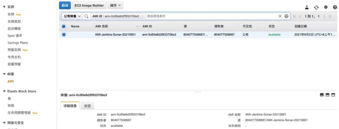 进入Amazon EC2服务页面,点击右侧菜单映像AMI,选择公有映像,筛选AMI ID: ami-09ee66d2d7dd20ad1(中国区),ami-0c60e8d2f933706e3(海外区),获取 Jenkins-Sonar 的 AMI 镜像