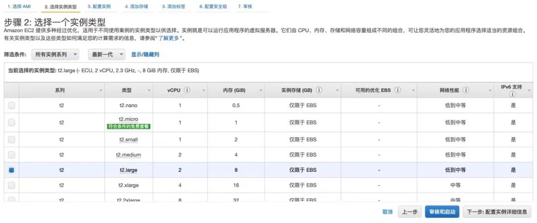 选择 t2.large 的类型,Amazon EC2类型可根据工作负载选择调整