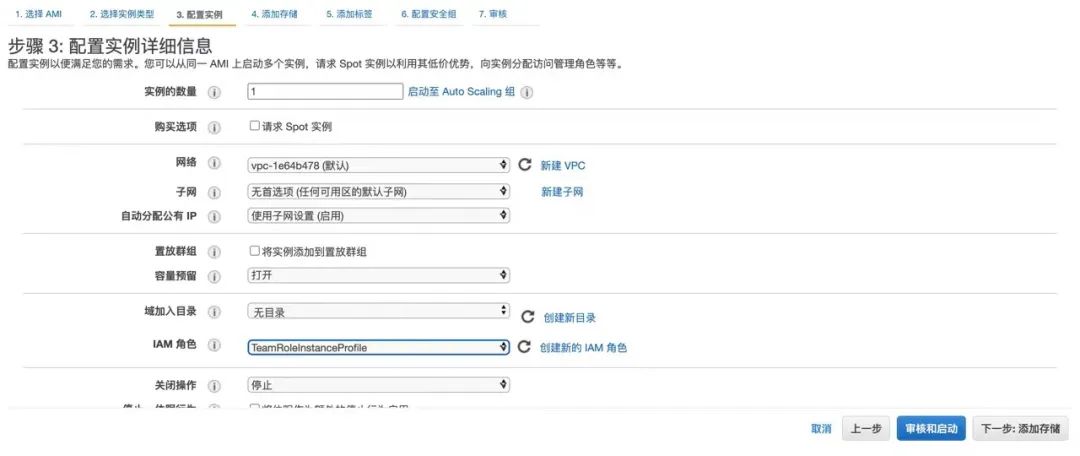选择自动分配公网 IP,IAM角色选择具有Amazon S3存储桶读写权限、Amazon CodeCommit、Amazon CodeDeploy访问权限的角色,其他用默认选项