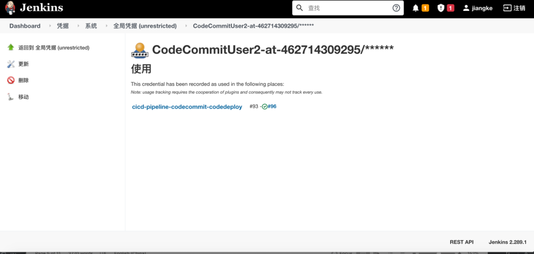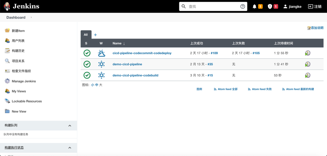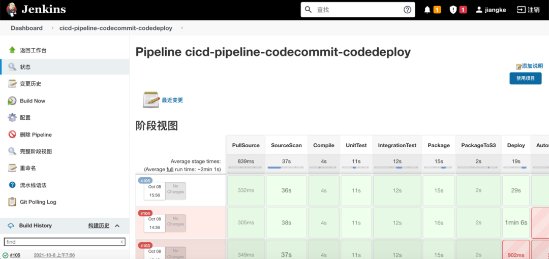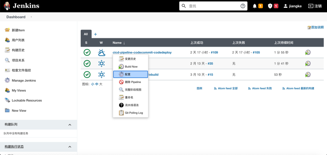 返回Jenkins DashBoard 中有 3 个预设的 pipeline,本文使用cicd-pipeline-codecommit-codedeploy,点击进入修改cicd-pipeline-codecommit-codedeploy 配置