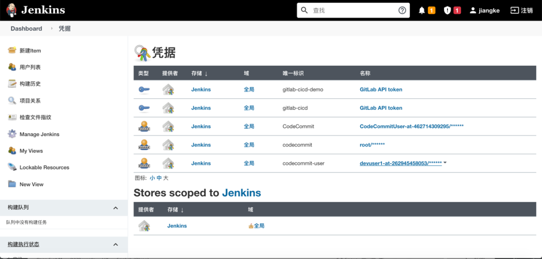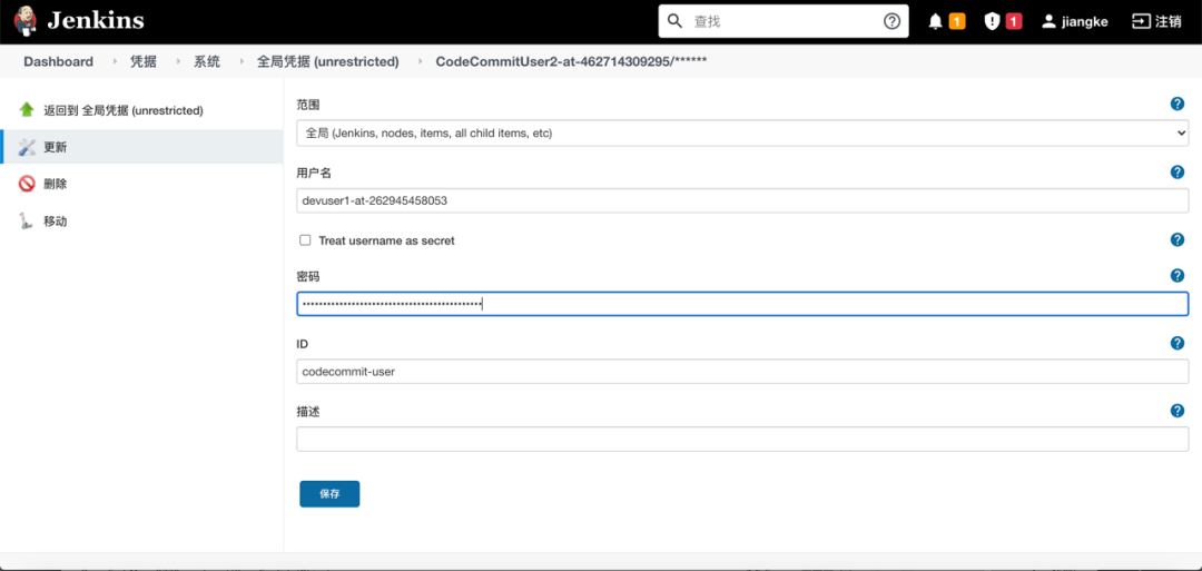 配置Amazon CodeCommit访问凭证,通过 Manage Jenkins->Manage Credentials