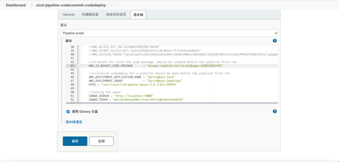 点击流水线,修改AWS_S3_BUCKET_CODE_PACKAGE环境变量为准备阶段创建的S3存储桶devops-template-build-packages-<123456789000>保存该 pipeline