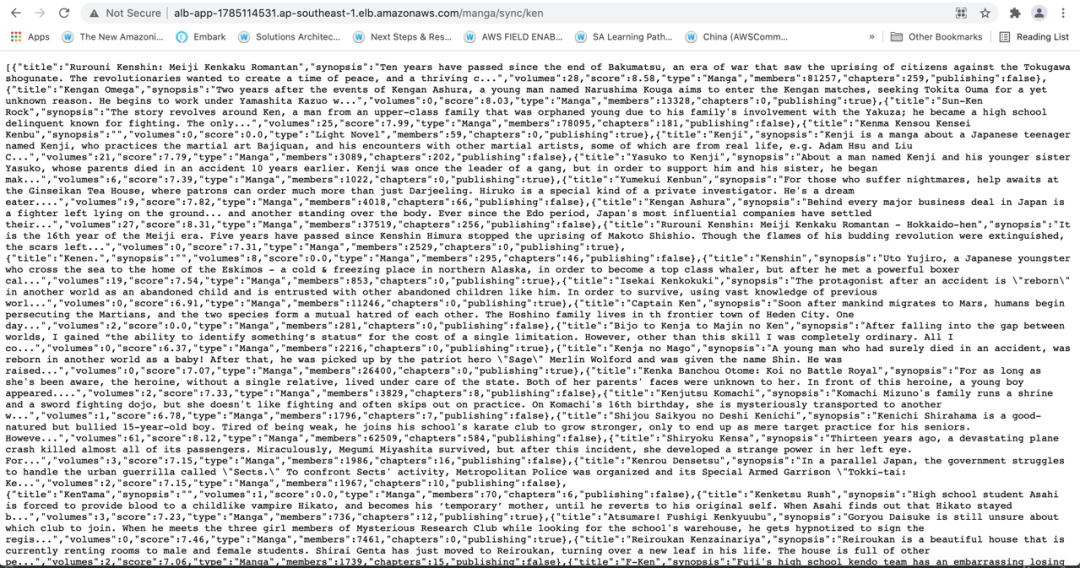 在浏览器中输入:http://:8080/manga/sync/ken 验证部署的应用是否返回关键字为ken的查询结果。