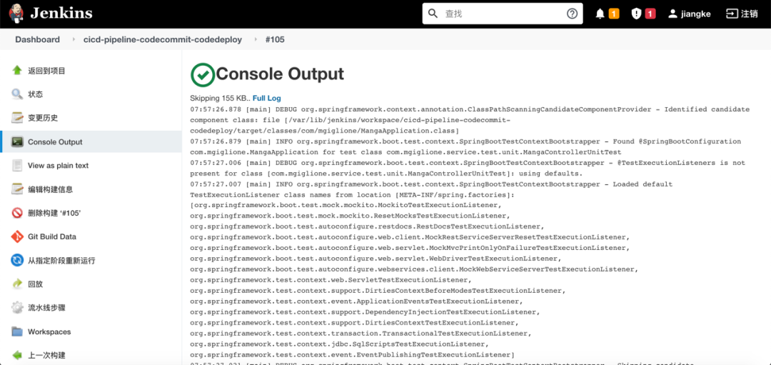 点击某个 build,在 pipeline 的 Console Out 中查看下详细的输出,包括代码扫描、单元测试、集成测试、编译、打包等过程。