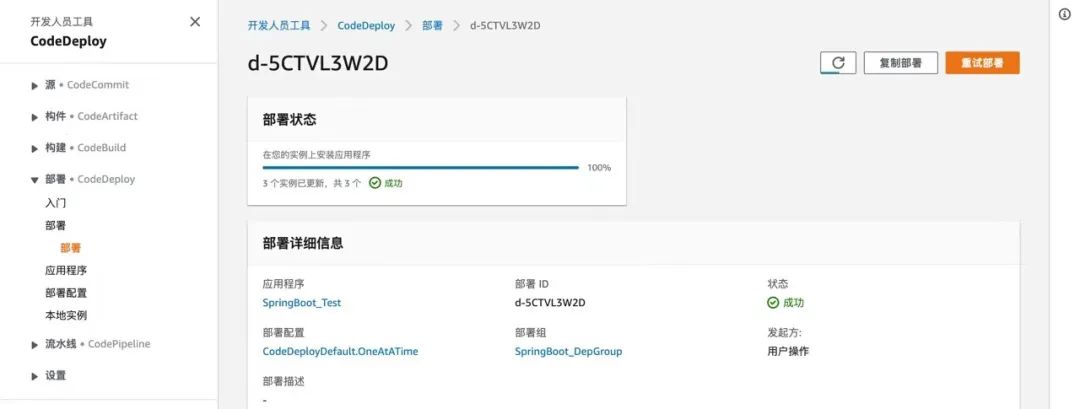 由于 Amazon CodeDeploy 是调用异步执行,Amazon CodeDeploy 的详细执行情况在 Amazon CodeDeploy 控制台中查看。