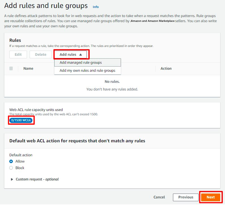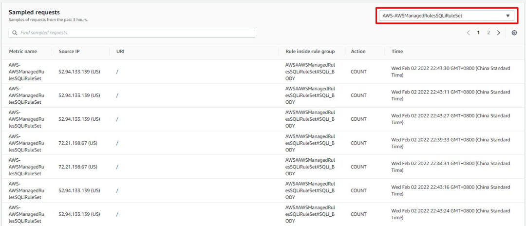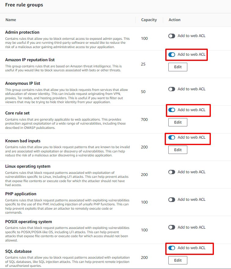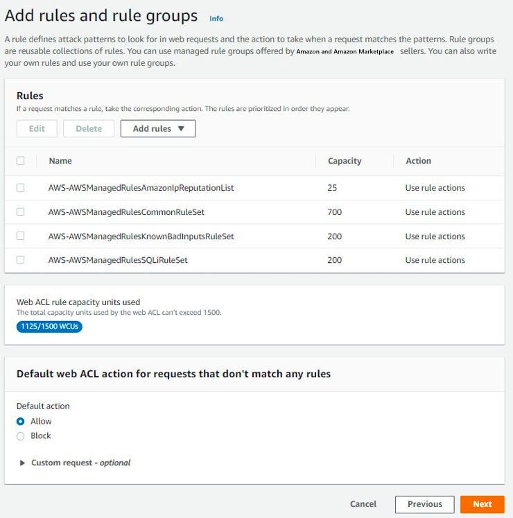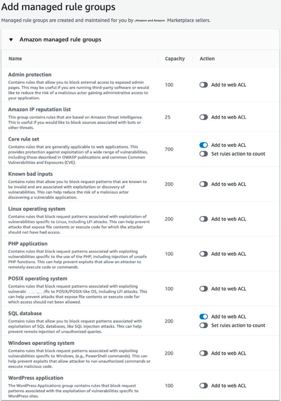 亚马逊云科技提供了一系列可供选择的规则组。例如Amazon IP Reputation list,Known Bad Inputs 和 Core rule set