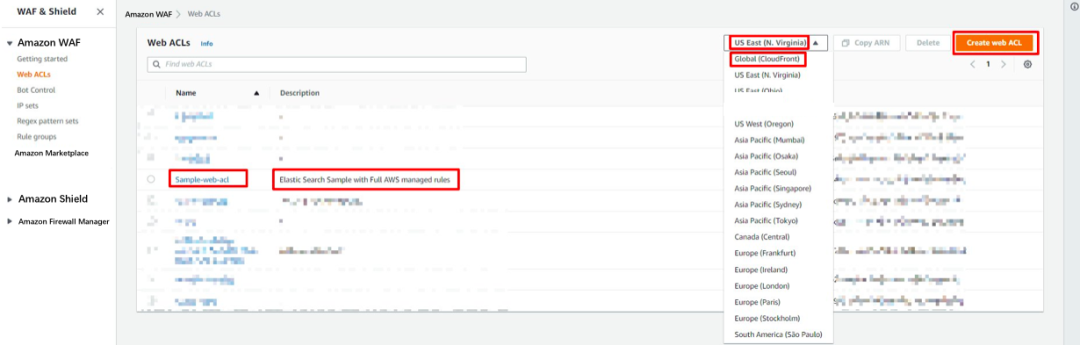 * 如果您的Web ACL配置完以后找不到,很可能就是因为查看的不是当时创建Web ACL的Region。