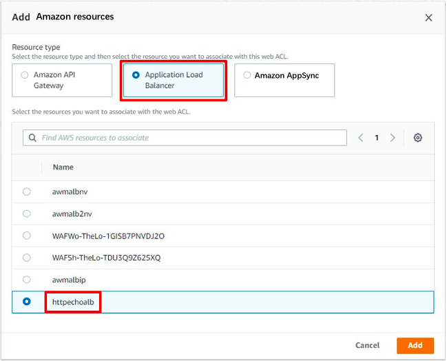 步骤三: 把我们创建的Web ACL 与步骤二创建的ALB关联起来。以使WAF防护功能生效。