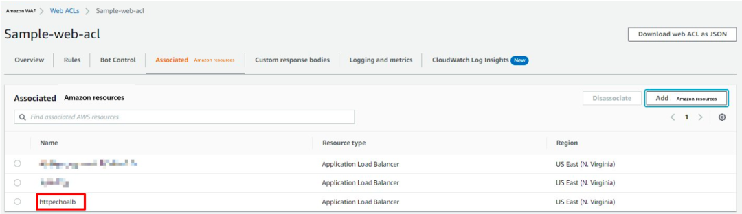 把我们创建的Web ACL – Sample-web-acl 与步骤二创建的ALB关联起来