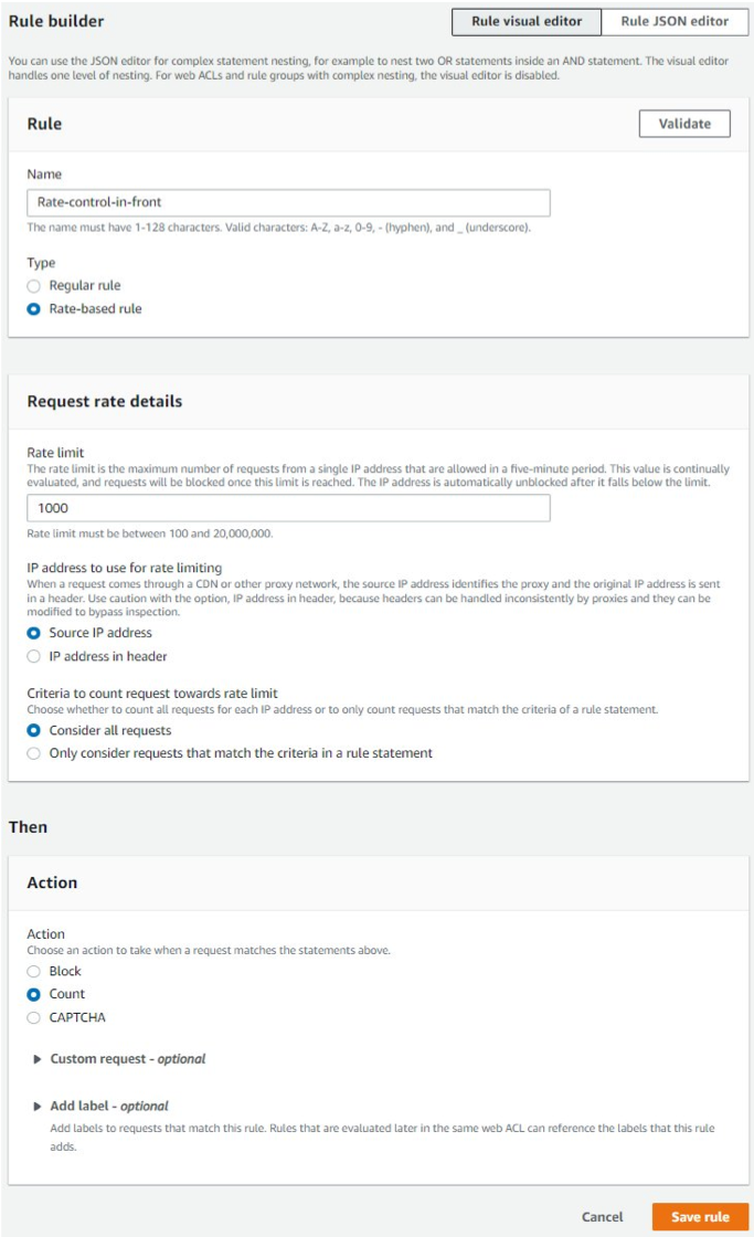 这里我们根据每个客户端访问的源IP进行限速,每个公网源IP访问的次数限定在每5分钟1000次以下。超过这个频率的请求将被过滤。具体大家可以根据自己应用的请求频率再做调整。有了这个限速规则,当外部使用HTTP泛洪进行攻击的时候,我们可以先把限速规则的访问速率降下来,先限制住请求数量最多的个别源IP,来恢复大多数正常用户的访问。