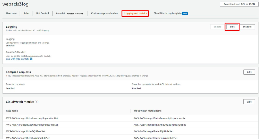 步骤五: 启用WAF日志,把日志记录进S3存储桶。并用Athena进行查询。