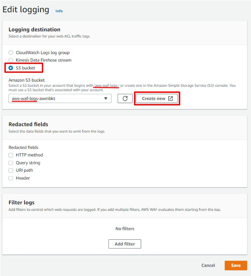 然后我们需要创建一个S3桶,注意桶名必须以aws-waf-logs-开始。否则我们在下拉框里就看不到这个新建的桶。