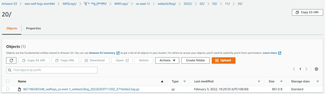 要查看WAF日志,我们可以去S3桶查看。如下图所示,可以看到waf日志根据每个Web ACL的名字分别做了子目录。因此多个Web ACL可以放在同一个S3桶里,并不会冲突。